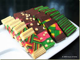 Modern Sarawakian layered cakes were introduced to the people of Sarawak..Sarawakian modern layered cakes can be divided into two categories: cakes with ordinary layers and cakes with patterns, motifs, or shapes. All must have at least two colors. The cake can be baked in an oven or microwave. The batter uses butter or vegetable oil, milk and eggs, and requires a strong arm or electric mixer to be properly prepared. The baked cake has a high, firm texture and the layers are fastened together with jam or a similarly sticky sweet substance. More detailed cakes often require special moulds to maintain. the perfect layer thickness. To learn more about this food, everybody can refer to this link : http://en.wikipedia.org/wiki/Kek_Lapis_Sarawak